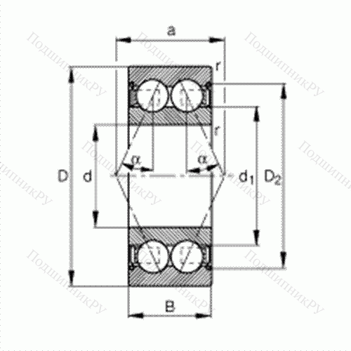 Основные размеры по DIN 628-3, двухрядные, щелевые уплотнения с двух сторон, угол контакта α = 25°